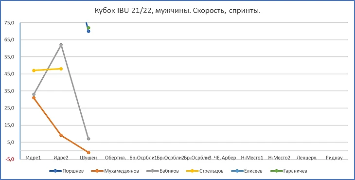 Спринт кое-что прояснил. Бабиков резко ускорился. Ну очень резко. При этом отстрелял на ноль. Про стрельбу позже, пока посмотрим на скорость. Поршнев из заоблачных высот (то есть, скоростного дна) первого этапа появился на графике. Пока всё равно медленный, но прогресс виден. Отходит от болезни, восстанавливается? С Гараничевым, похоже, то же самое происходит? Обоим надо ускоряться. На КР не один Цветков мечтает о Кубке IBU. Первушин вот проявил себя. Пусть ветераны не обижаются, но с сопоставимыми результатами интереснее и перспективнее на Кубке IBU будет выглядеть Первушин, чем они. Стрельцов заболел. По мне, так количество заболеваний зашкаливает. Впечатлил скоростью Ильназ Мухамедзянов. На графике его точка ушла ниже нулевой отметки. Это значит, что в спринте показал скорость выше, чем средняя пятёрки быстрейших.