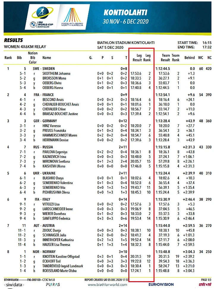 Если открыть финишный протокол любой эстафеты, там можно увидеть 2 столбца - “Leg result” и “Leg rank”. Я в английском, мягко говоря, несилен, но это можно перевести, как “время и место на этапе”. То есть за сколько спортсмен пробежал свой этап, и какое место он занял по чистому времени на этом этапе. Биатлонист может передать эстафету хоть 20-м, пробежав при этом этап быстрее всех, это как раз мы и увидим в этих столбцах. Согласитесь, это очень, очень-очень информативно.