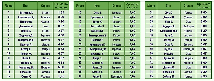 В шаге от призовой тройки остановилась Маркета Давидова. Причем она показала тот же результат, что и Вирер, но расположилась выше из-за более удачного выступления на чемпионате мира (мой рейтинг, что хочу, то и ворочу). По этой же причине в десятку не попала Ханна Оберг.