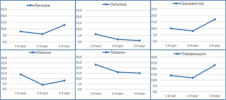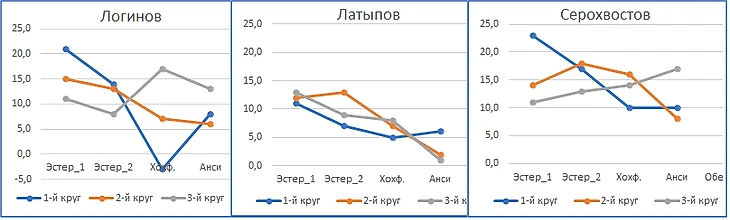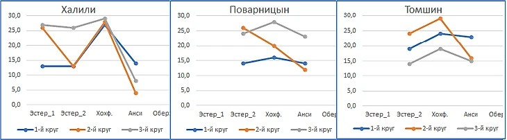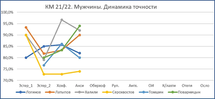 На графике хороша видна динамика. К сожалению, Данила как опустился ниже 75%, так там и остаётся. У Халили по-прежнему какие-то скачки точности. Но даже так у него за этап больше 90%. Карим, стабилизировать бы это. Впечатлил Поварницын ростом точности. У Логинова и Томшина на этих этапах разнонаправленная динамика получилась. Но у Логинова коридор достаточно узкий, виден стабильный средний уровень. Надо поднимать для претензий на подиумы и, тем более, медали. График точности Латыпова очень похож на график Резцовой. Учитывая, что графики скорости у них также совпадают, можно провести аналогию: Латыпов также привыкал с более высоким скоростям, пока не срослось в Анси. И это хорошо на данный момент.