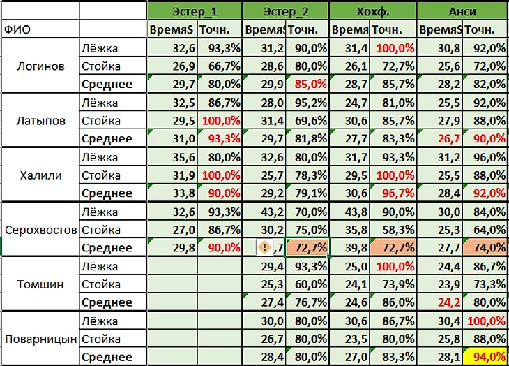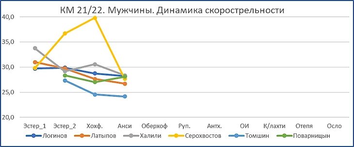 В целом за прошедшие этапы у всех хорошая динамика скорострельности. Все, кроме Поварницына, ускорили стрельбу относительно своего первого этапа на КМ. Начинали парни так же медленно, как и девушки. Но уже со второго этапа дело пошло веселее.