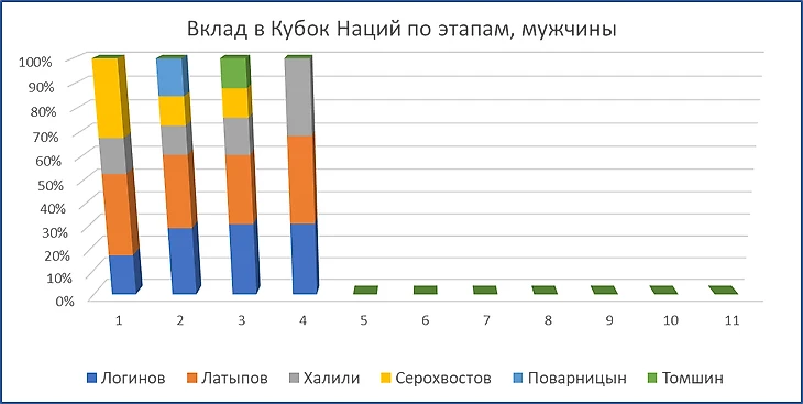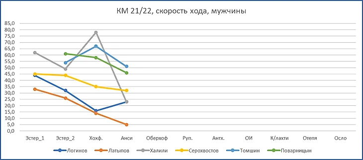 Что происходило со скоростью в спринте? За исключением Логинова все ускорились относительно предыдущего этапа. Логинов, хоть и просел по скорости, оказался в тройке самых быстрых у нас. Поварницын и Серохвостов продолжили ускоряться. Халили шараханье в скорости привело к лучшему ходу в сезоне. С нулями мог быть в цветах. Ускорился и Томшин, показав наименьшее отставание за три этапа на КМ. Ну, и особенно порадовал Латыпов. Почти прямая линия ускорения с начала сезона. В итоге так разогнался, что забежал на подиум. У Поварницына и Томшина отставания, конечно, очень большие. Есть над чем работать.