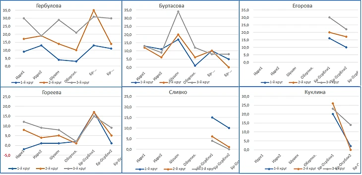 На следующих графиках можно увидеть динамику кругов. Уже хорошо видно, что У Гербуловой третий круг заметно проседает. Про Буртасову так не скажу, потому что отрицательный пик на третьем круге случился во время болезни. В остальных гонках раскладка плюс-минус хорошая. У Гореевой интересно посмотреть раскладку в следующем спринте. По моему разумению, она должна быть лучше вчерашней. Про динамику на Кубке IBU у Егоровой, Куклиной и Сливко говорить пока рано - всего два спринта в течении двух дней. Хоть и на этом материале можно кое-что рассмотреть: у Вики самый медленный первый круг, у Егоровой наоборот. Лариса, на мой взгляд, второй спринт пробежала в своей привычной уже раскладке, с просадкой на третьем круге.