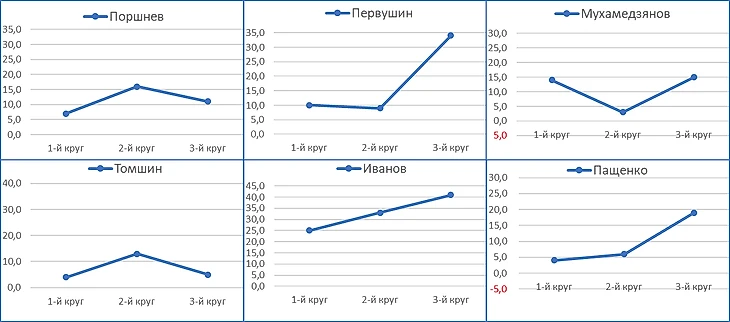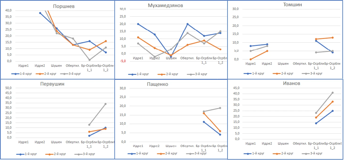 Ещё одна красивая линия от Поршнева - динамика скорострельности. Молодец, что тут ещё скажешь? Парни (кроме Томшина) показали кучную скорострельность. Но невысокую. Вася в этом компоненте смотрится инопланетянином.