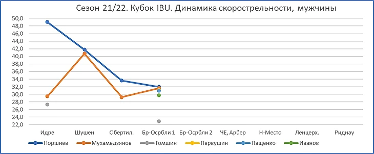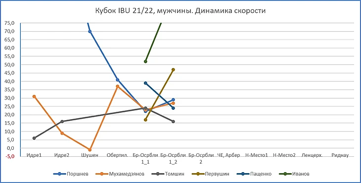 График, отражающий динамику скорости, приобрёл странный вид. И в нём трудно пока разобраться. Затрудняет восприятие также разнонаправленность линий. Попробуем. Поршнев продолжил резко ускоряться в первом спринте, но во втором слегка откатился. Мухамедзянов пока заметно медленнее себя образца первой половины декабря. Во втором спринте также слегка замедлился относительно первого. Томшин наоборот, похоже, разбежался. Первушин начал за здравие, показал лучший ход среди наших в первом спринте, но во втором резко просел. Пащенко во втором спринте ускорился. А вот Иванов откровенно слабым оказался. Даже более быстрый первый спринт - не уровень Кубка IBU.