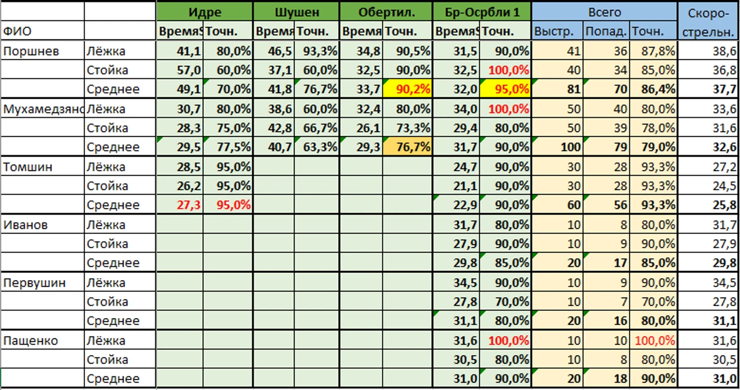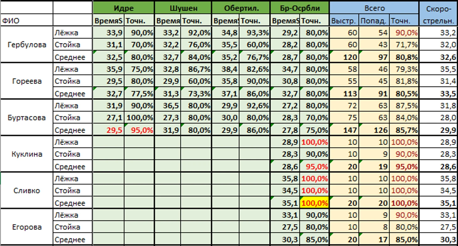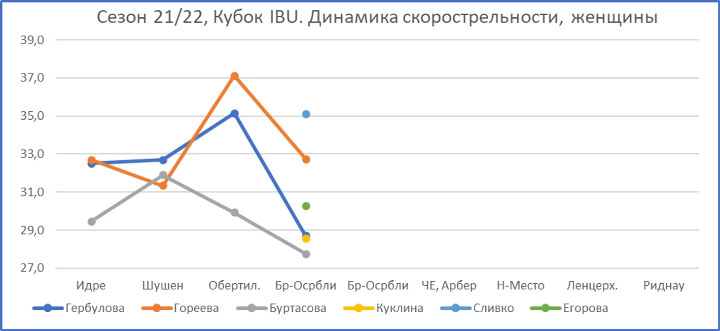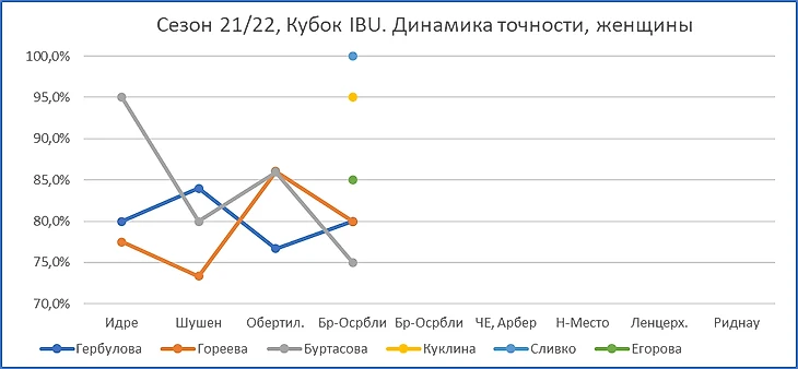 Если смотреть на динамику по сезону, то у всех наблюдаются скачки в точности стрельбы. Посмотрим, как пойдут дальше дела у Вики и Лары. Уж больно высокую планку задали с первых же гонок. Если я правильно понимаю работу Шашилова, то на следующем этапе у Гореевой можно ожидать увеличения скорости на лыжне и повышения точности. Посмотрим.