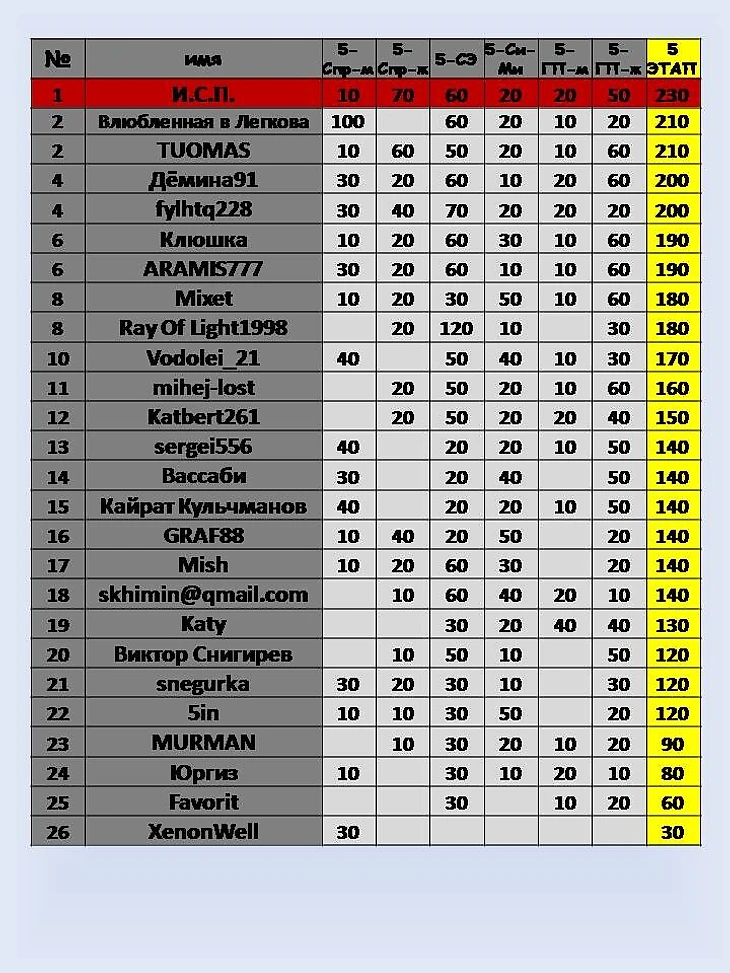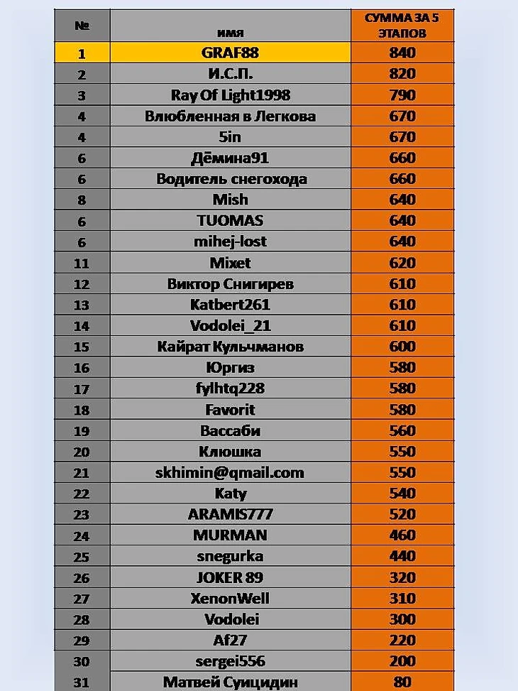 Ну и напряженная борьба нас ждет в общем зачете.   Предварительная тройка призеров определилась и даже вырвалась немного вперед, но мы ее стремительно пытаемся достать.