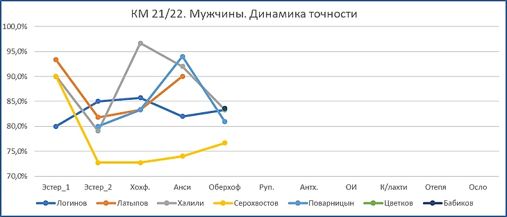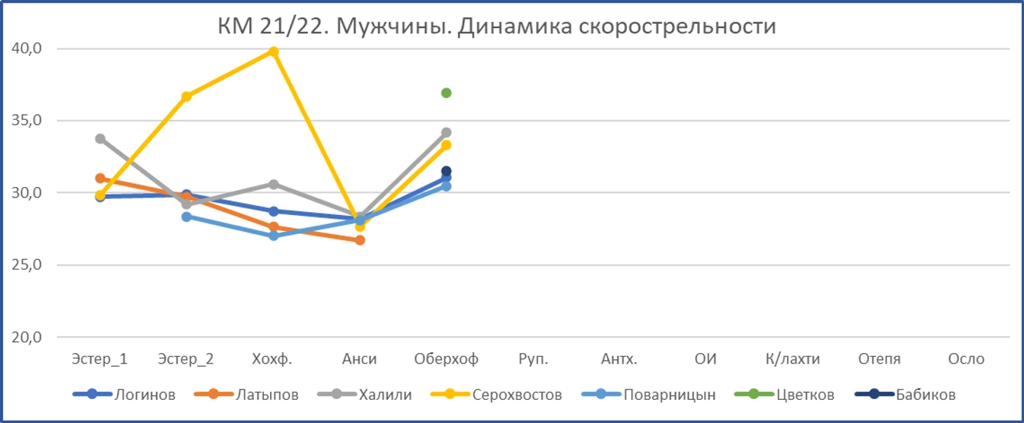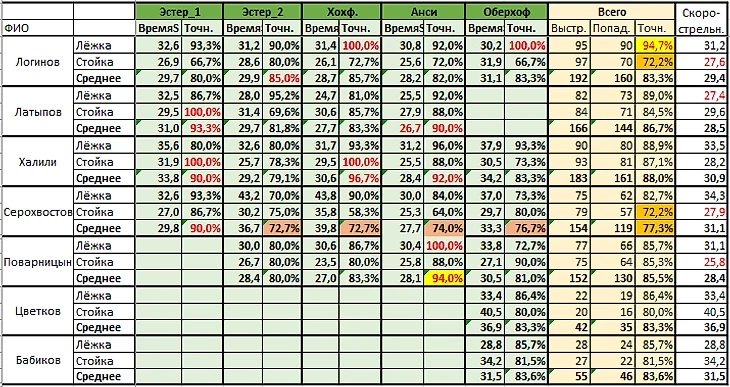Как и девушек, точность стрельбы у парней невысокая. Оберхоф, однако. Но и тут есть исключение - лёжка Логинова. Но отличную стрельбу лёжа "компенсировал" откровенно плохой стойкой, худшей в команде. А средняя точность снова худшая у Серохвостова.