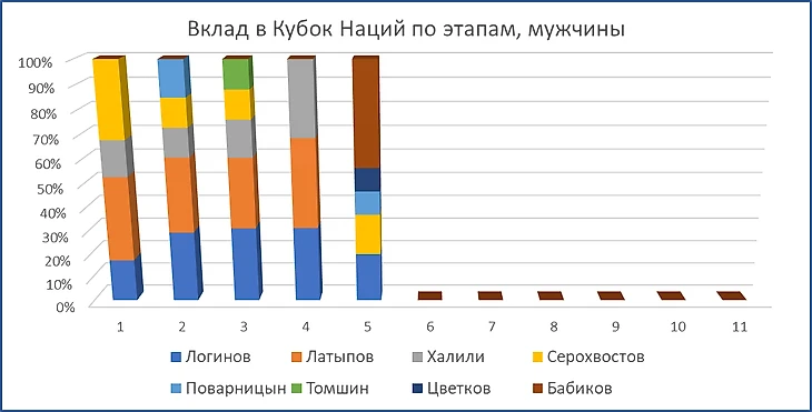 За счёт эстафет появились очки в зачёте КН у Цветкова. Бабиков отметился здесь и в СП, и в эстафете. Логинов почти сравнялся с Латыповым (отстаёт на 3 очка).
