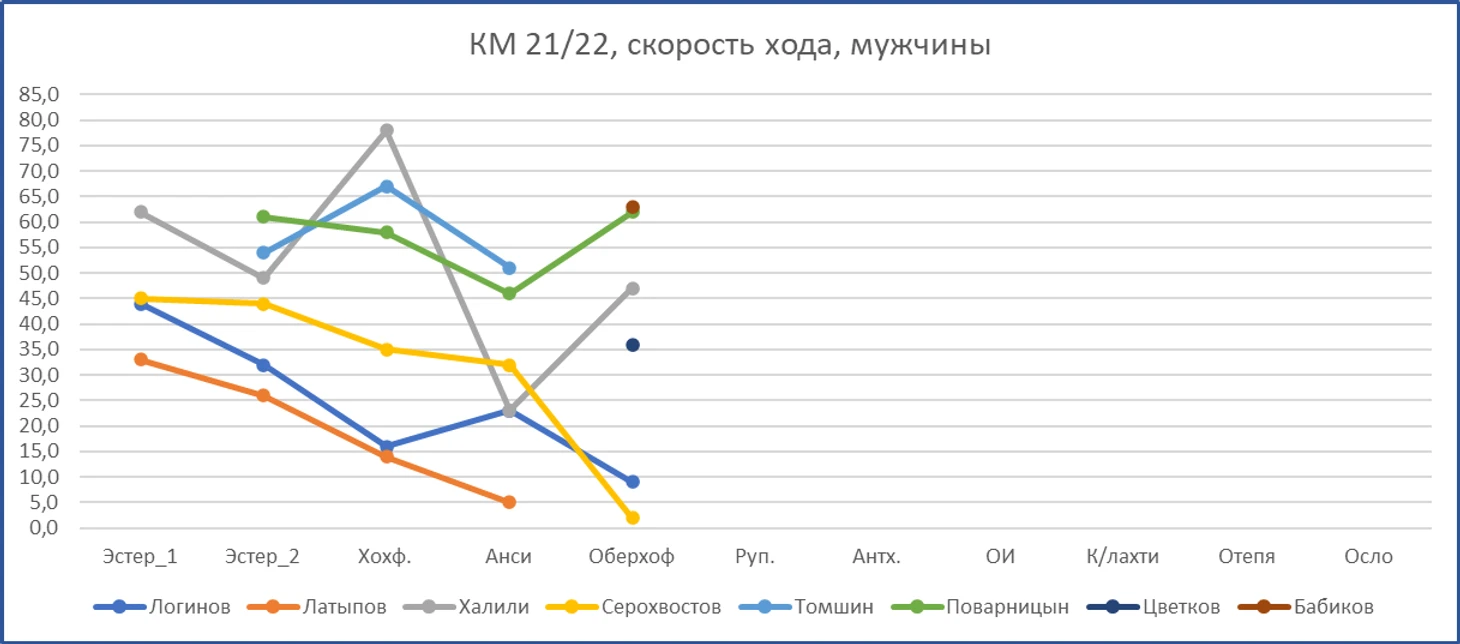 Латыпов получил два положительных результата теста, продолжает сидеть на карантине. Тревожно за него. Непонятно, как аукнется вообще и для Олимпиады в частности. А на этапе подиумную эстафету подхватил Логинов. Да ещё и выиграл. Мои поздравления! По результатам хорошую гонку провели также Бабиков и Серохвостов. По пойдём по порядку. Начнём, как обычно, со скорости хода. На графике видим определённое расслоение по скоростям. Данила разогнался так, что показал и свой лучший ход по сезону, и лучший ход в команде. В пелотоне у него третье время на лыжне, сразу за братьями Бё. Само по себе просто превосходно. Мы же помним, что это у него первый взрослый сезон, и первый сезон на КМ. И что на КМ он попал полуслучайно. Лучший свой ход показал и Логинов. Третий ход у Цветкова. Для первой гонки после долгого отсутствия вполне себе неплохо. Карим сдал по сравнению с этапом в Анси. Поварницын чисто математически показал худший ход по сезону. На этом же уровне оказался и Бабиков. Если смотреть только на график скорости, я бы сильно поостерёгся петь Антону дифирамбы и сходу включать его в олимпийский состав.