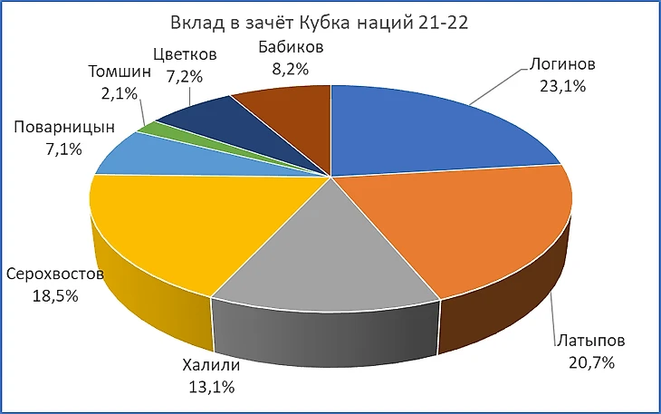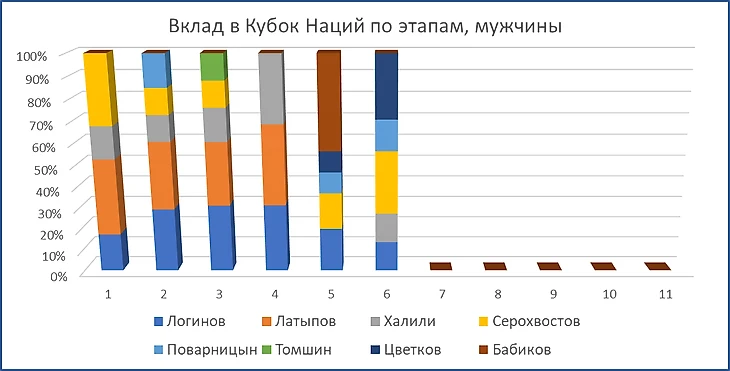 Из-за отсутствия Латыпова лидером в зачёте Кубка Наций стал Логинов. Справедливости ради, он постарался хорошо для этого. У мужчин явного лидера в этом зачёте нет, выделяется четвёрка.