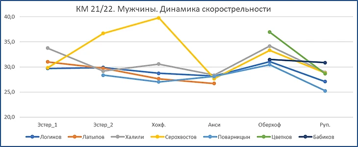 И по скорострельности рост. И опять у всех, кроме Бабикова. Один неудачный спринт, а всю картину испортил. Судя по графику, у Поварницына и Логинова в Рупольдинге лучшая скорострельность по сезону. В посте про девушек в этом моменте высказал предположение, что, возможно, начался выход из-под нагрузок, набор формы пошёл. Интересно, аналогии с парнями уместны?