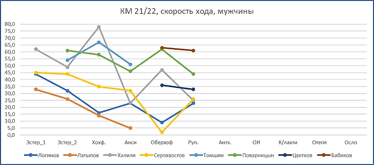 Что касается оценки скорости, то необходимо учитывать отсутствие нескольких биатлонистов, которые, к примеру, в спринте Оберхофа (да не только там) были в пятёрке быстрейших: братьев Бё и Кюна. Это объясняет, например, график Антона Бабикова. На графике видно даже малюсенькое ускорение. Но по месту в Оберхофе был 40-м по скорости, в Рупольдинге - 64-й. То есть, относительно пятёрки быстрейших остался почти при своих, но относительно заметной части пелотона замедлился. С учётом замедления пятёрки быстрейших посмотрим на скорости всех остальных парней. Ускорились Поварницын и Халили (даже с учётом вышесказанного). Замедлился Цветков. И получается, что Логинов и Серохвостов пробежали заметно медленнее, чем в Оберхофе. С чем это связано - пока не прозвучало. Возможно, и не прозвучит. Зато парни отмечали неприятные ощущения по ходу гонки. Поскольку видим разнонаправленную динамику хода, то вряд ли есть одна, общая причина.