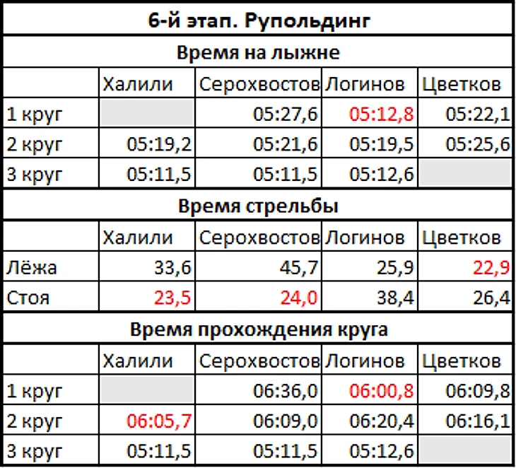 Порадовали парни в эстафете. Ещё одно поздравление! Судя по цифрам в следующей табличке, парни прошли свои этапы и круги в основном ровно. На первом круге выделяется ход и общее время у Логинова. На втором - у Халили. Цветков на фоне остальных выделяется только стрельбой. Карим в целом по цифрам выглядел предпочтительнее Максима. Пишу это с попыткой заглянуть в Пекин.