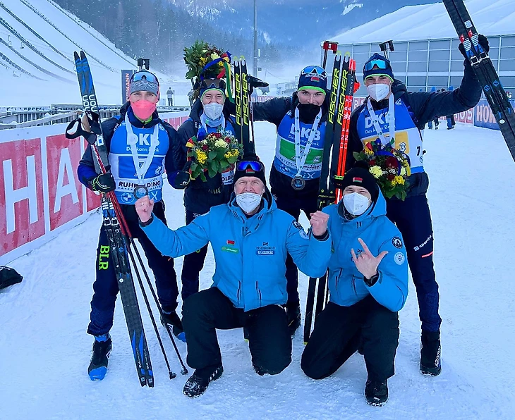 Белорусская команда сегодня выступила в эстафете на этапе Кубка мира в немецком Рупольдинге. В составе Антона Смольского, Никиты Лобастова, Дмитрия Лазовского и Максима Воробья смогли навязать конкурентную борьбу соперникам и завоевать Бронзовые медали. 1 место сборная России, 2 место Германия. Фото БФБ.