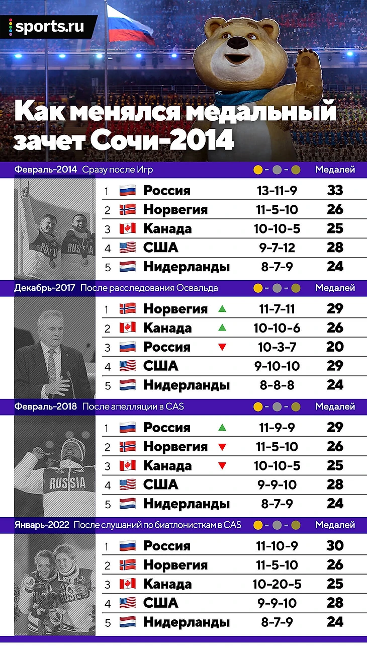 2) В таком варианте зачет застыл примерно на три года – в ноябре 2017-го после допинг-скандала, докладов Ричарда Макларена и Дениса Освальда наших спортсменов массово лишили медалей.