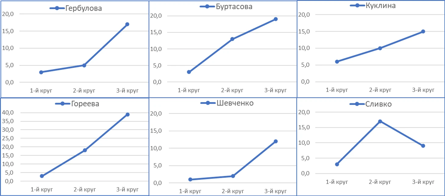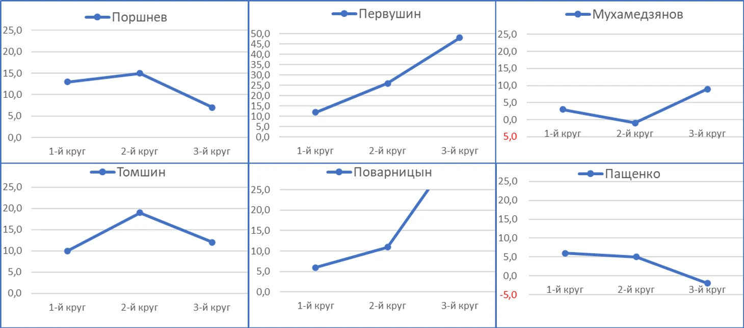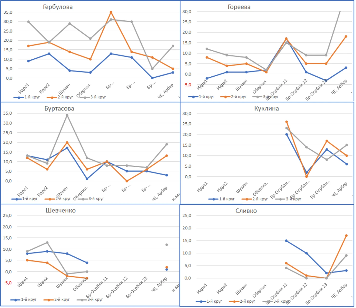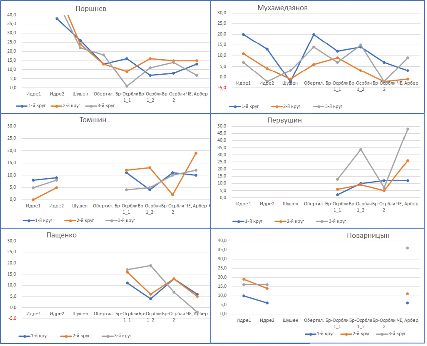 Динамика скорострельности. Но даже в таких условиях у парней разнонаправленное движение по скорострельности. Впрочем, Поршнев и Первушин ускорили стрельбу только относительно слабого по этому показателю предыдущего этапа. Пащенко показал удивительную стабильность в скорости стрельбы, невзирая на ветер. Из-за ветра по этому графику никаких выводов и попыток что-то написать о трендах не будет.