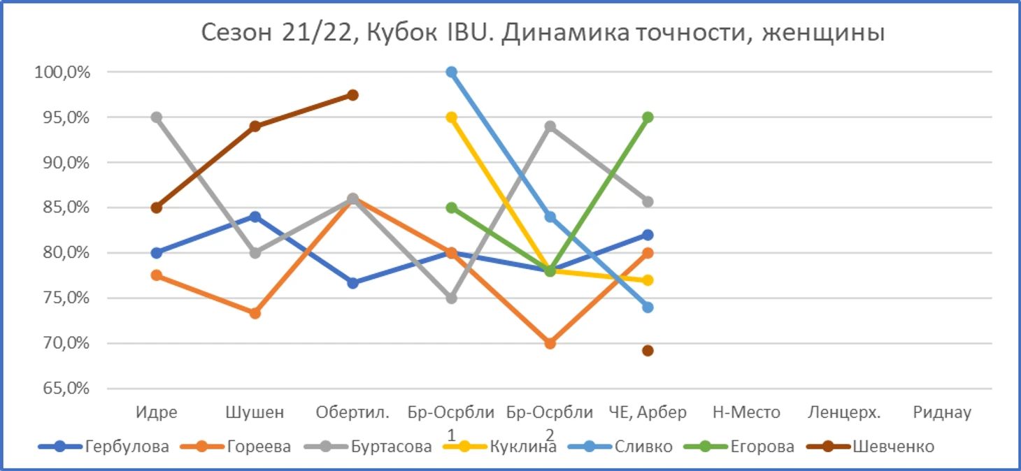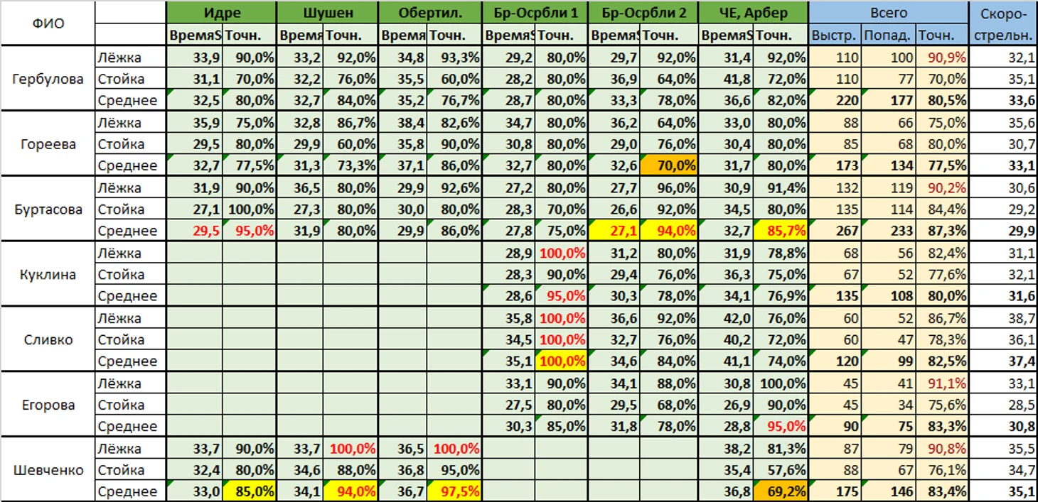 Исходя из условий стрельбы в Арбере особого смысла разбирать динамику не вижу. Две Насти (Гореева и Егорова) подняли точность за счёт одной гонки каждая. Гербулова стреляла почти на своём уровне. По поводу резкого падения точности Вики Сливко и Насти Шевченко тревогу бить не буду. Сложилось впечатление, что Вика потеряла форму перед ЧЕ. А Настя ещё не набрала. Когда обе в порядке, даже в этих условиях могли стрелять лучше. Лариса озвучила информацию о проблеме с винтовкой. Странная ситуация. Что, кроме Лёши Волкова выявить проблему некому было? Или Лариса с такими просьбами ни к кому до этого не обращалась? Судя по отсутствию информации до того, видимо, не обращалась. Должен ли был, к примеру, Загурский, инициировать подобное тестирование? Всех винтовок, потому что сборная. У меня нет однозначного ответа.