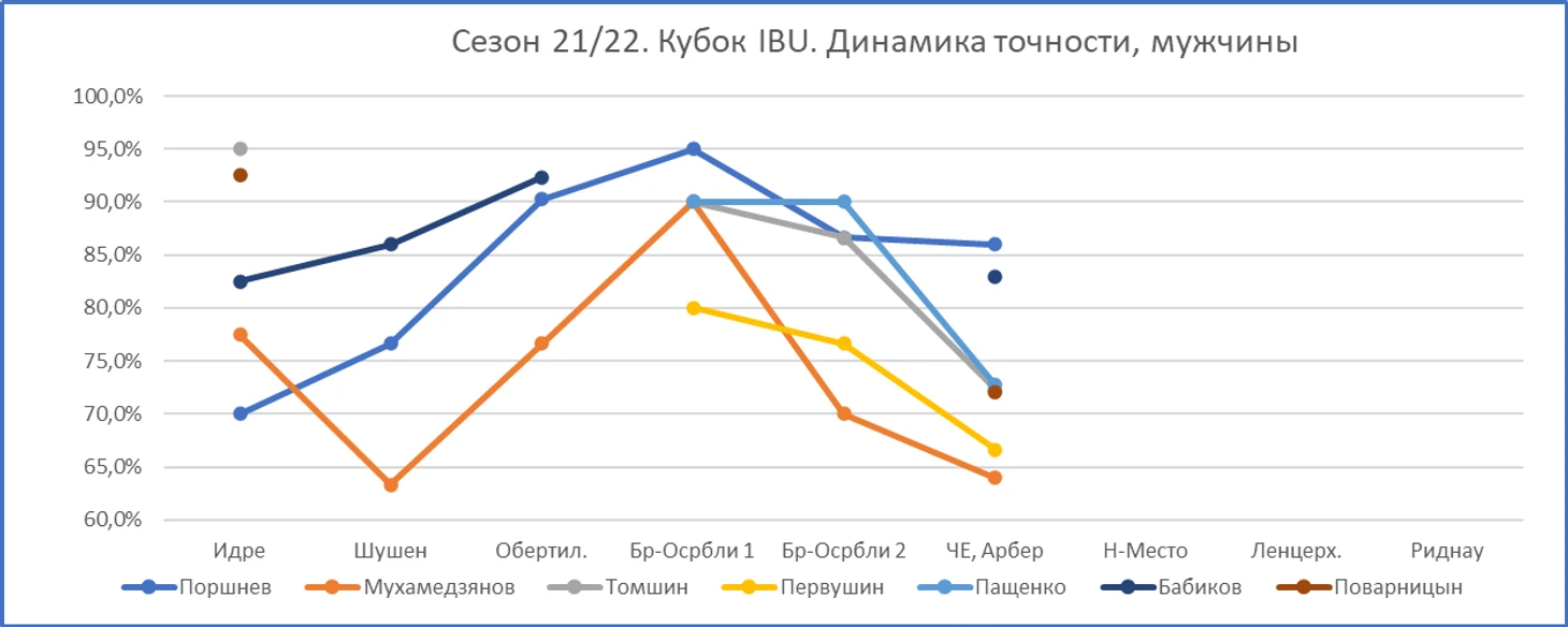 Динамика по кругам. Поршнев третий спринт подряд очень ровно держит второй круг. В Арбере отпустил первый, зато перекрыл это на третьем. В итоге общее отставание получилось чуть меньше, чем в предыдущем спринте. Мухамедзянов наоборот, ускорился на первом, но ещё сильнее просел на третьем. У Томшина уже какие-то горки со вторым кругом рисуются. При этом 1-й и 3-й круги уже третий спринт подряд совсем близко друг к другу. Глядя на график, видно, что Вася замедлился в Арбере на втором круге. У Первушина продолжает прыгать третий круг. Но в Арбере и второй просел. Нетрудно представить, какой будет график раскладки в этом спринте. А вот Пащенко ускорился, выдав свой лучший на Кубке IBU в сезоне третий круг. У Поварницына первые два круга получились визуально как минимум не хуже, чем в декабрьских спринтах. А вот третий получился совсем плохим.