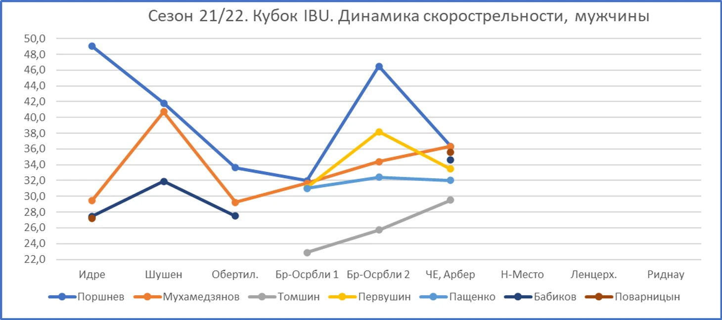Скорость хода. По аналогии с девушками скажу несколько слов о скоростях в других гонках. В ИГ своего "бегунка" у нас (как Сливко у девушек) не было, парни ногами проиграли от минуты до двух плюс. Бабикову это не помешало завоевать медаль. Удивительно, но золото Антон отдал не на лыжне, а на стрельбище - слишком много проиграл в скорострельности. А на лыжне быстрейшим у нас был Ильназ Мухамедзянов. В отличие от девушек, подтвердил свою скорость и в спринтерской гонке, оказавшись вместе с Петром Пащенко в пятёрке быстрейших. Как-то очень глубоко по скорости провалился Михаил Первушин. Для него это был первый взрослый статусный (медальный) турнир. По результатам не получился. Что ж, пока ограничимся тем, что Миша получил очередной взрослый опыт. Просел на лыжне Александр Поварницын. От участника КМ я ожидал большей скорости. Поршнев держит уровень. Который позволил ему завоевать медаль. Сдал на лыжне и Вася Томшин. Все готовились к турниру, а на выходе получилось разное. Антон связку пропускал, поэтому на графике его нет.