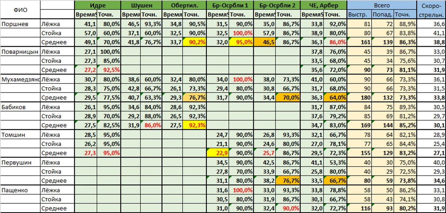 Стрельба. Про условия для стрельбы написал выше, в женском разделе. Отметил хорошую точность Поршнева. Никите в смысле средней точности повезло - не бежал эстафету. Как и Бабиков ГП. Оранжевым выделил плохую точность Ильназа и Миши. У Ильназа почти на каждом этапе с точностью беда. Про Первушина же пока можно написать, что "точность потерял". Помним, что годом ранее на ЮЧМ медали брал в первую очередь хорошей стрельбой. В этом сезоне видно, что стал быстрее ногами. Видимо, проблема роста. Но к следующему сезону баланс надо бы найти. На более высоком уровне, конечно. У тандема Каминский - Максимов с этим дела обстоят хорошо. Особенно для Серохвостова.