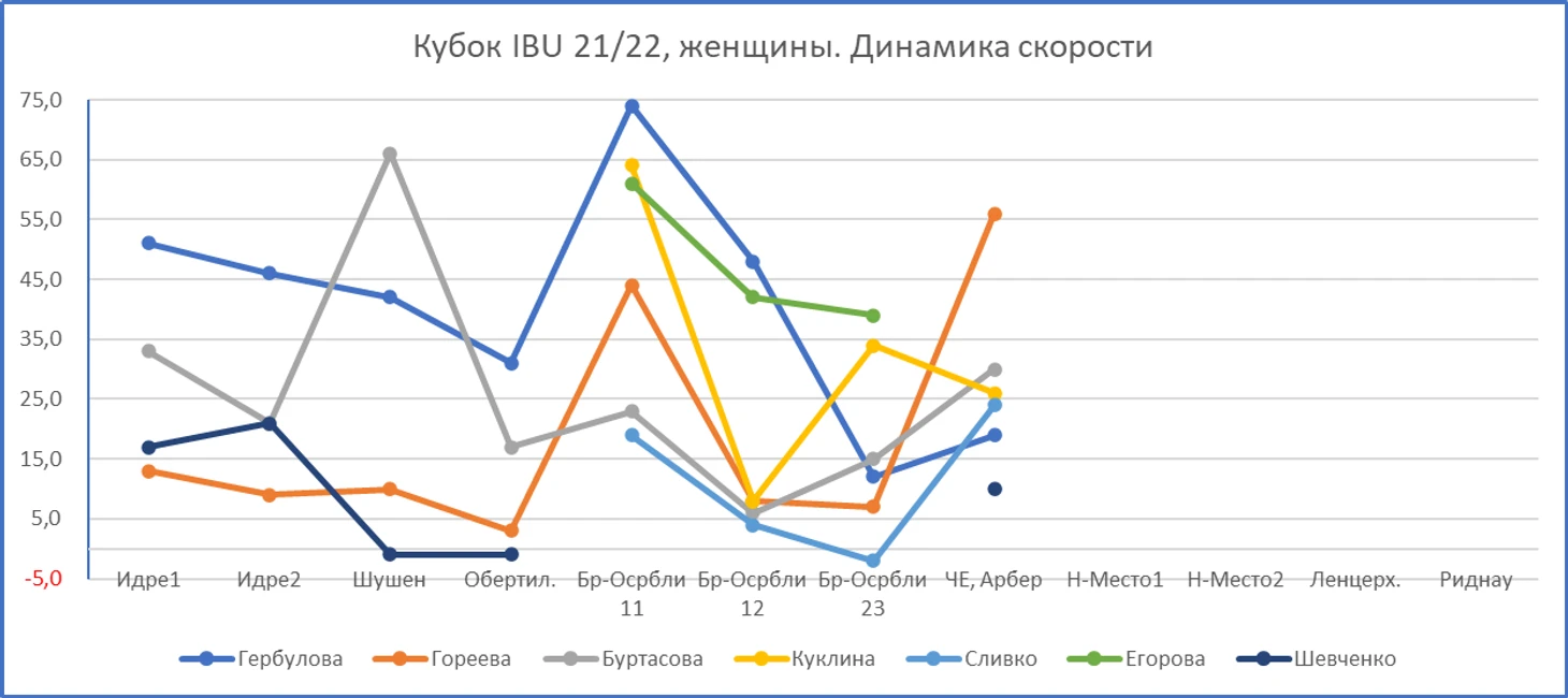 На графике только спринт. Но скажу несколько слов о скорости и в ИГ, и в ГП. Надеюсь, так получится более объективно посмотреть на готовность к турниру. На графике сразу бросается в глаза задранная вверх линия Насти Гореевой. На ГП не вышла по медицинским показаниям. Думаю, что это можно применить и ретроспективно, на день раньше, к спринту. Что означает эта формулировка - непонятно. Настя расстроена своим состоянием. Даже высказалась в том духе, что оказалась не готовой к сезону. Если сравнивать её результаты и наши (и, похоже, её самой) ожидания, то картина нерадостная. Памятуя скоростную феерию во второй половине предыдущего сезона, я вот ожидал, что она и в это сезоне будет ходом блистать. По факту она показывала неплохую скорость, не лучшую на Кубке IBU. Но это перечёркивалось плохой стрельбой. В основном из положения лёжа. Теперь будем ждать, что же означают слова "по медицинским показаниям": простуда (недомогание) или что-то другое, связанное с подготовкой к сезону. В любом случае это уже не прибавило положительных эмоций. Виктория Сливко в ИГ показала хорошую скорость, вторую в пелотоне (быстрее была только Алина Стремоус). И с одним промахом вполне могла быть на пьедестале, если бы не медленная стрельба. Все остальные наши девушки ходом уступили Вике минуту и более. Но в спринте картина поменялась, условно говоря, на 180 градусов. Лучшую скорость показала уже Настя Шевченко. То, что Настя спринт пробежала достаточно быстро, у меня не вызвало недоумения. Во-первых, преодолевает последствия травмы, разгоняется. Во-вторых, вспомнилась схожая ситуация из декабря, когда Настя на фоне недомогания медленно прошла ИГ, но в спринте показала вторую скорость (между Хильдебранд и Шово). К слову, у Гореевой в той гонке была 4-я скорость, менее секунды проиграла Шово. Так что скорость в спринте не Шевченко, а всех остальных вызвала у меня недоумение. У всех, кроме Куклиной, относительно предыдущего этапа наблюдается падение скорости. Но и на этом фоне отмечу Наташу Гербулову - "покатавшись" на скоростных горках, по сезону, ближе к ЧЕ (и на самом чемпионате) стала показывать вполне приемлемую скорость хода. В СП была в одном промахе от медали. Замедление относительно предыдущего этапа можно было бы списать на приезд на ЧЕ быстроногих девушек с КМ. Но кого можно к таким отнести, кто был среди скоростных лидеров на этом турнире? Стремоус, Шово, Хеттих, Коломбо? Нет, со всеми перечисленными на разных этапах Кубка IBU в этом сезоне соревновались. И перечисленные как-то не относятся к скоростной элите пелотона КМ. На мой взгляд, вопрос находится в плоскости подготовки к этому конкретному турниру. Велась ли она и как? Почему восстанавливающаяся после травмы Шевченко оказалась быстрее остальных в команде в СП и ГП? Отдельно разбирать скорость в ГП не имеет смысла из-за контактной специфики гонки.