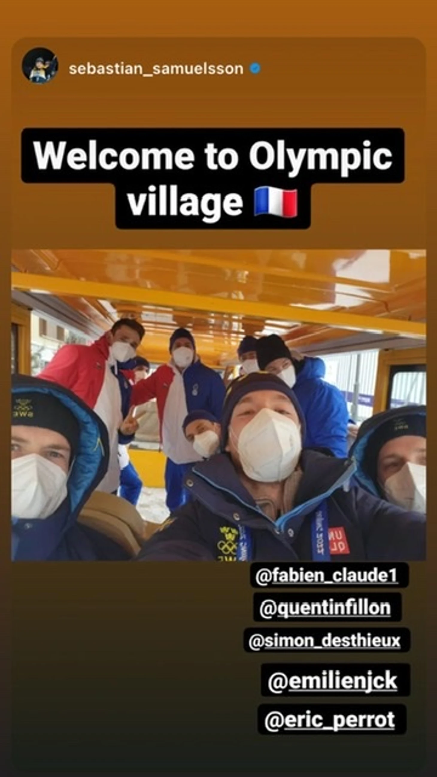 Французская команда уже прибыла в олимпийскую деревню! Себастьян Самуэльссон и товарищи приветствуют мушкетёров: