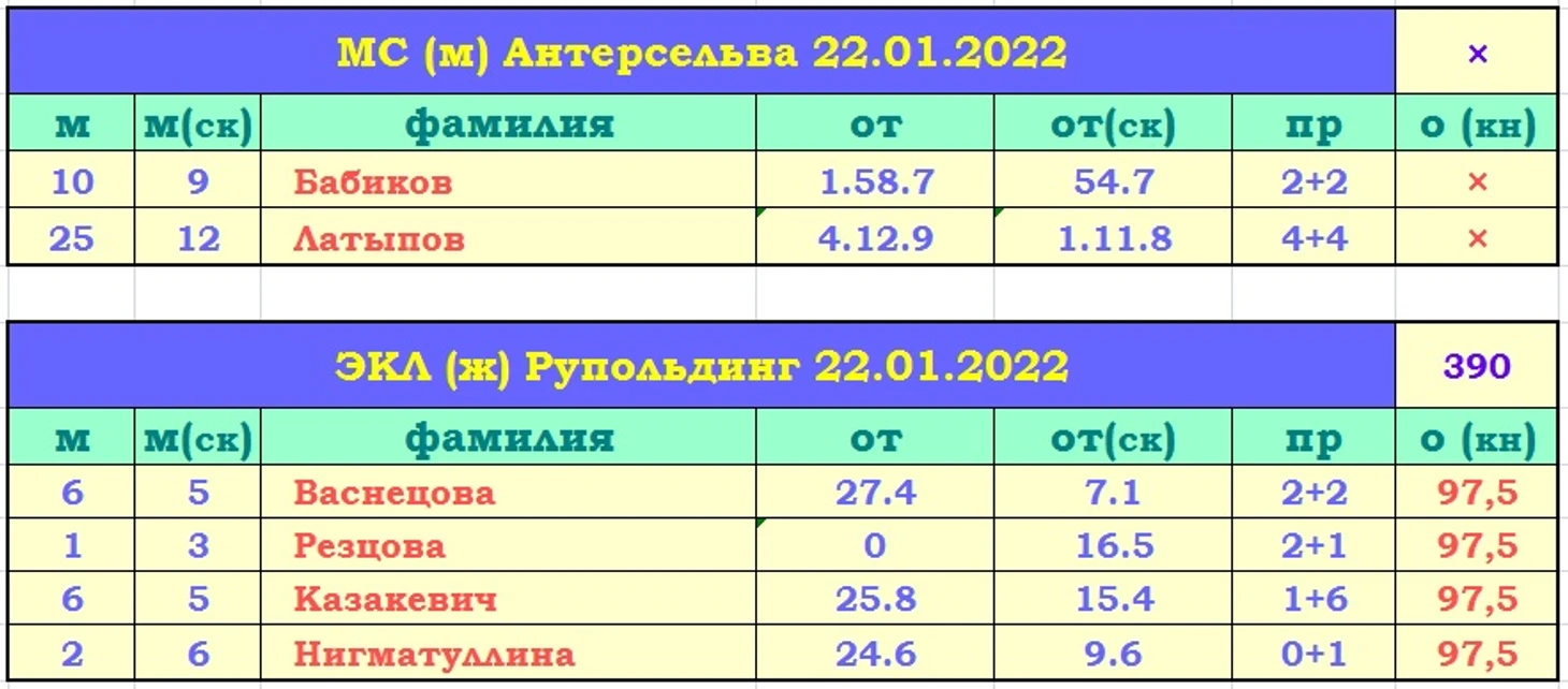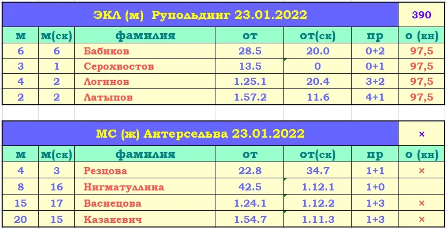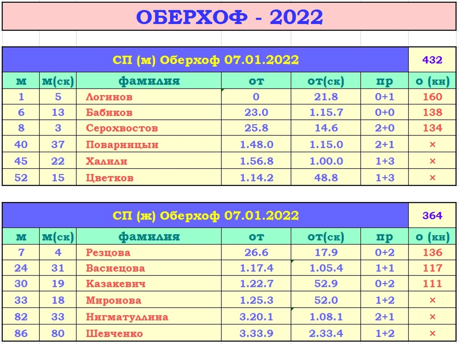 Напомню расшифровку аббревиатур в шапке таблицы: М - место занятое спортсменом в гонке. М(ск) - место в скоростном рейтинге гонки. ОТ - отставание от победителя гонки. ОТ(ск) - отставание от скоростного лидера гонки. ПР - промахи (лёжа + стоя). О(кн) - очки в зачёт Кубка Наций.