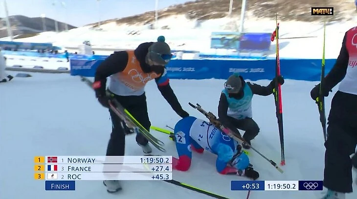 Итог: 5 промахов (2 мишени остались незакрытыми), а также худшее время на стрельбе среди всех участников – 1 минута 27 секунд. Вперед проскочили норвежцы, уступавшие нам по ходу гонки свыше полутора минут, и французы. У России – бронза, которой не получается радоваться.