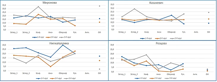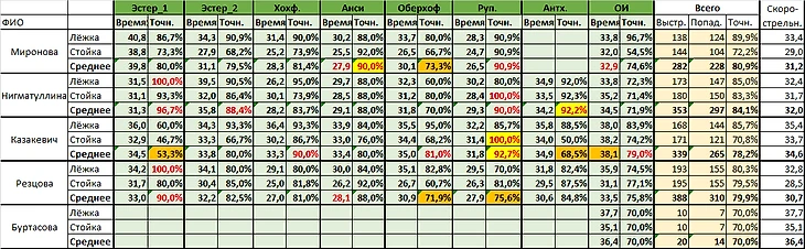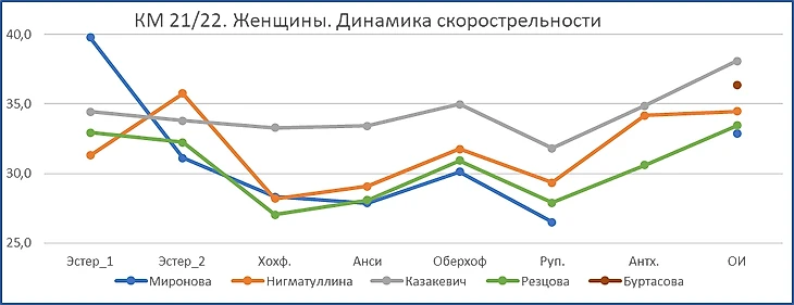 Динамика скорострельности. Здесь также картинка отображает непростые стрелковые условия. Одно исключение: скорострельность Ульяны осталась на уровне Антхольца. Вряд ли это такая особенность у неё по стрельбе в горах. Потому как в предыдущем сезоне горные этапы никак в плане скорострельности не выделялись.