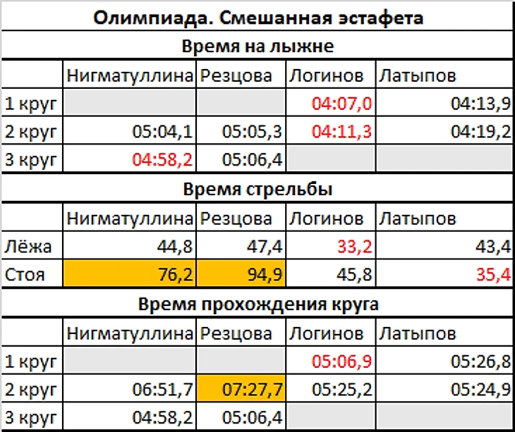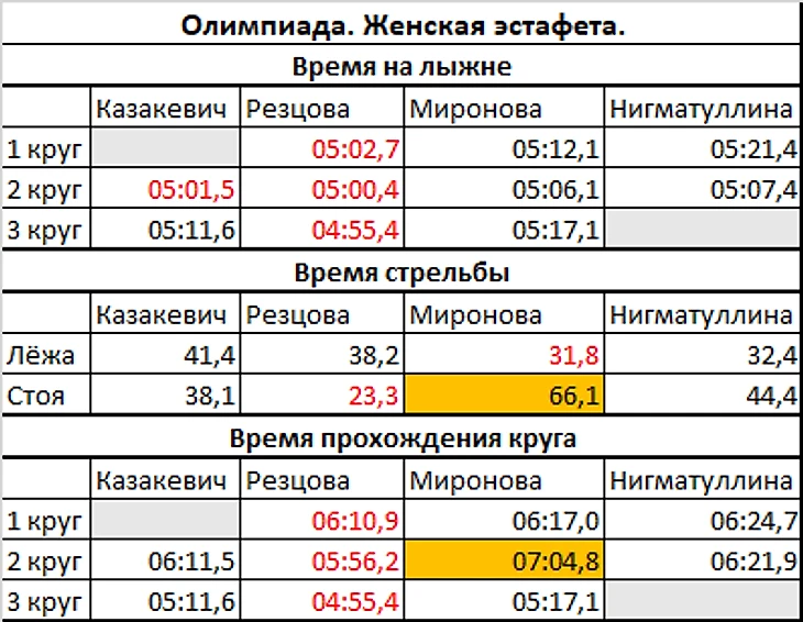 Сразу разберём и вторую медальную гонку - классическую эстафету. Напомню, красный шрифт - хорошие цифирки. Залито оранжевым - плохие. Как видим, Кристина было лучшей у нас в этой эстафете. Света быстрее других у нас отстреляла лёжку. Да и на стойке не особо задержалась (66,1 секунды, сравните это время и время на стойке Ульяны и Кристины в СЭ, на предыдущей табличке). К слову, Латыпов на свои 8 выстрелов потратил 87,6 сек. Вот такой позитив имеется :) В итоге мы имеем серебро Олимпиады со штрафкругом. Круто! У Ульяны в этой табличке нет красненьких цифр. Да, третий круг, возможно, и был бы лучшим, если бы его можно было сравнить с другими. А на сопоставимых кругах Ульяна бежала медленнее остальных. Но этого оказалось достаточно для серебра. Молодчинка! Иру я оставил на "закуску". Про цифры. Привезла 17 секунд отставания. По сезону лучше было только в Эстерсунде, когда на 1-м этапе бежала Кристина. 17 секунд - вполне рабочее отставание. Когда-то Гу просил, чтобы Света Слепцова привозила не больше. Допустила Ира по одному промаху на каждом из рубежей. Вполне нормально. Да, в прошлом сезоне такая стрельба в исполнении Иры в эстафетах смотрелась исключением из правила. Сейчас - просто нормально. Я после её трёх штрафкругов в эстафете Антхольца был скорее спокоен за её стрельбу, чем нет. Сам же просил заработать штрафкруги до Пекина. Света, видимо, не в курсе была :))) И ходом Ира смотрится вполне нормально. На сопоставимых кругах быстрее Иры была только Кристина. Учитывая, что в МС, заключительной гонке турнира, Ира ходом тоже была лучше Ульяны, а финишный круг прошла в одни ноги с Кристиной, и на пару секунд лучше Ульяны, я предполагаю, что форму набирала по ходу Олимпиады. Трудно сказать, помогло бы ей участие в ИГ в скорейшем наборе формы, или нет. Исключать этого нельзя. Но имеем факт, который не изменить.
