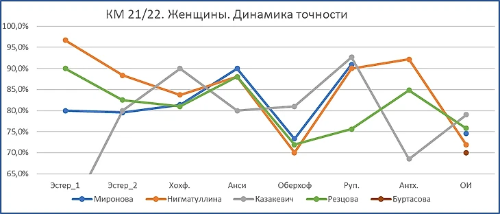 Динамика точности. У почти всех падение точности, что и понятно. О ветровой лотерее все знают, да и написал выше. У Иры, наоборот, точность выросла. Но выросла относительно этапа в Антхольце, где она зашла на три круга в эстафете. И в целом точность у неё лучшая. Была бы лучшая у Ульяны, не стал бы, наверное, это отмечать. У Иры пока отмечаю. Надеюсь, что в скором времени перестану, ибо станет делом обычным.