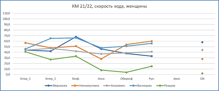 У Иры пик не просматривается, даже с учётом допущения выше, про пик лучших бегунков. У Иры продолжается удивительная стабильность в скорости по всему сезону. Это результат подготовки Шашилова "вдолгую"? Мысли про такую работу возникли у меня в январе, когда я не увидел ускорения девушек из группы Шашилова. Результат такой подготовки может проявиться уже в следующем сезоне: можем увидеть у его группы другой уровень. Вот такие мысли уже возникали.