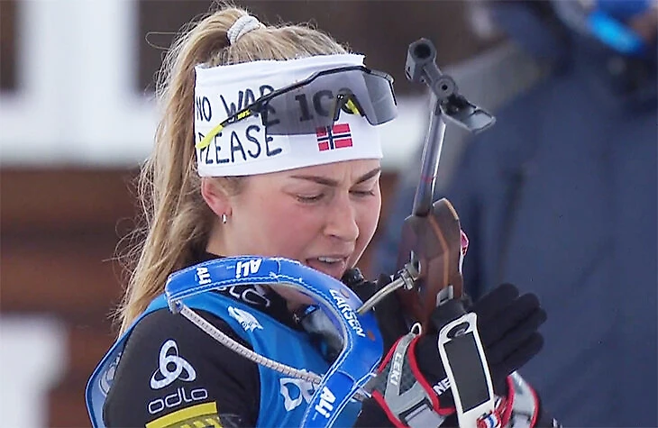 А норвежки вышли в шапках/повязках с надписью no war please – так, чтобы при стрельбе эти слова точно попадали в кадр.