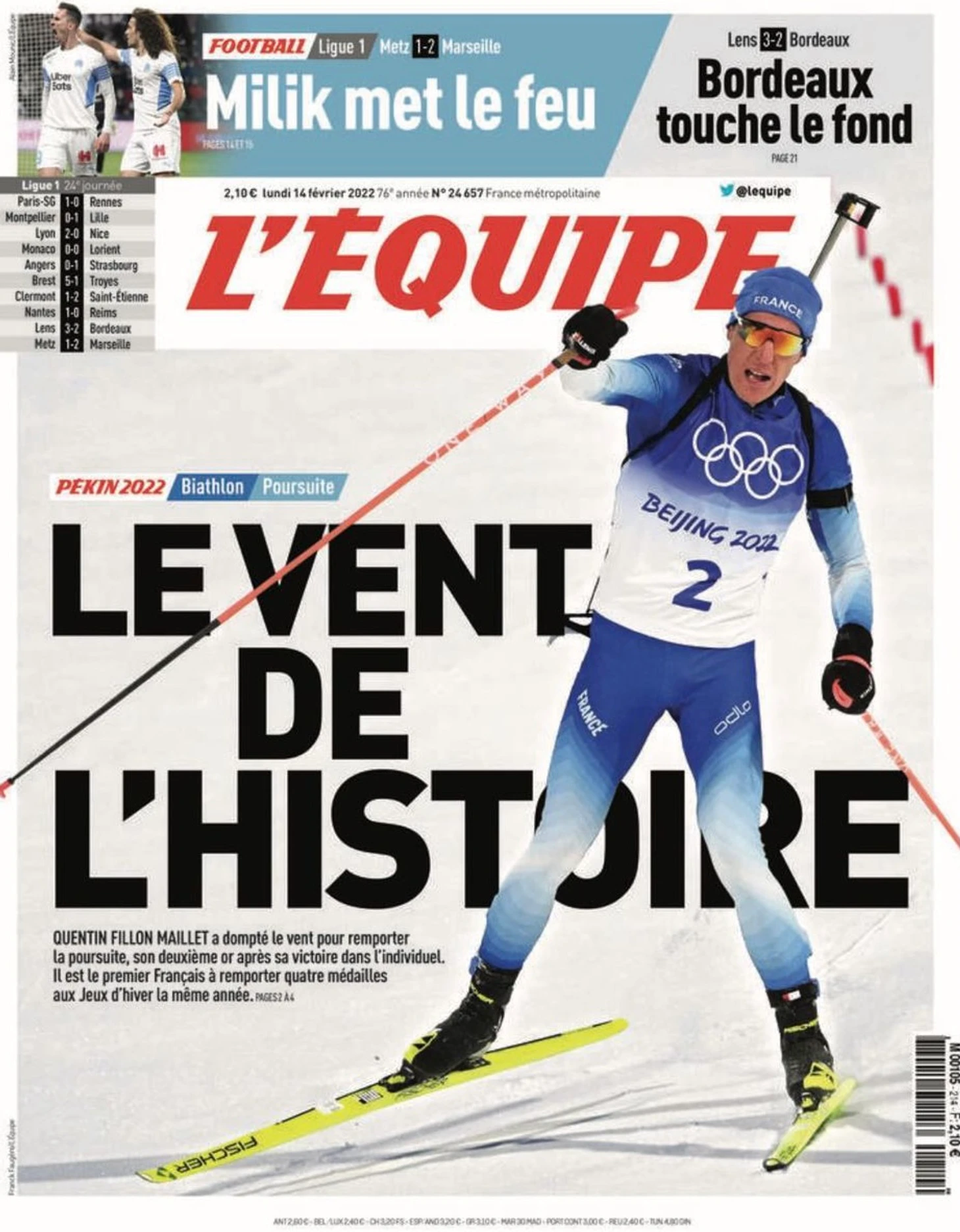 Кантен не смог защитить свой титул чемпиона Франции, упустив верную победу из-за эпической последней стойки (четыре промаха), но частично реабилитировался на другой день, совершив чудо для своей эстафетной команды. Приняв эстафету на десятом месте в полутора минутах от лидера, великий шоумен наконец-то собрался, вспомнил, как стрелять, и вытащил своих ребят на второе место, не сумев догнать лишь товарища по сборной Антонена Гигонна.