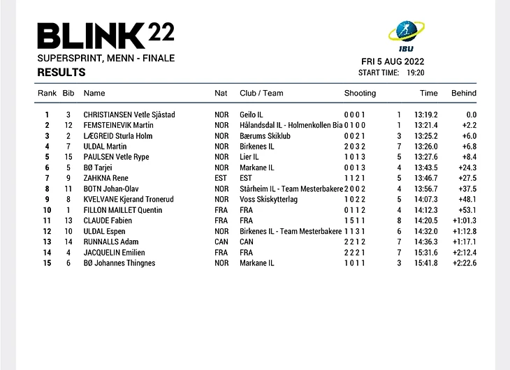 На этом двукратный олимпийский чемпион решил, что уже достаточно порадовал своих фанатов, и включил режим старого доброго Кантена — десятое место в финале суперспринта (куда он, кстати, отобрался только благодаря победе в стрелковой дуэли) с 15/20, двенадцатое в финале масс-старта. Впрочем, и не он один — топы как будто сговорились завалить соревнования, что французские, что норвежские. И только Ветле решил, что победа на летнем фестивале тоже не будет лишней, а ещё лучше две :)