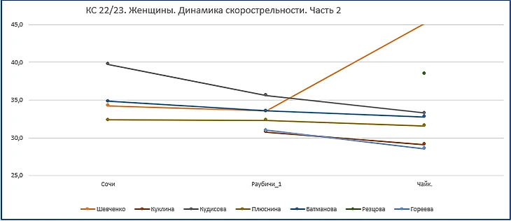 По ходу спринта в Чайковском по сивидате отметил непонятную потерю времени Настей Шевченко на лёжке. Просматривал затем видео, но её лёжку не показали. Что там у неё случилось, не знаю. Именно эта задержка на стрельбе и дала такое падение скорострельности.