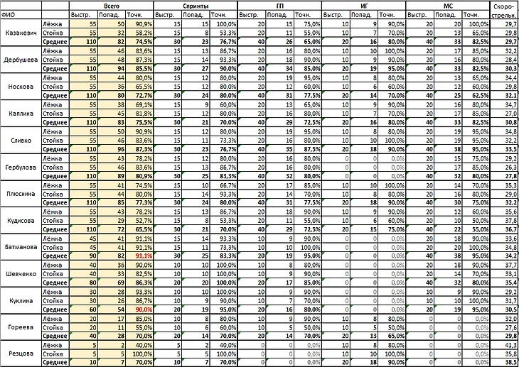 Глубоко копать по летним стартам не буду. Рановато, пожалуй. Но несколько слов о стрельбе Иры Казакевич напишу. Лёжка - хорошо: 90,9%. Со стойкой по цифрам катастрофа. Но есть одно "но": скорострельность. По прошлому сезону Ира тратила на стойку 33,7 сек. Сейчас - 29,8. Ищет стрельбу. Сама понимает, что на стойке не получается. Общая скорострельность по прошлому сезону - 34,6 сек. Сейчас - 29,7. Это очень большой скачок. Пожелаю ей успехов в поиске и наработке навыка в более быстрой стрельбе. Время до зимних стартов у всех ещё есть.
