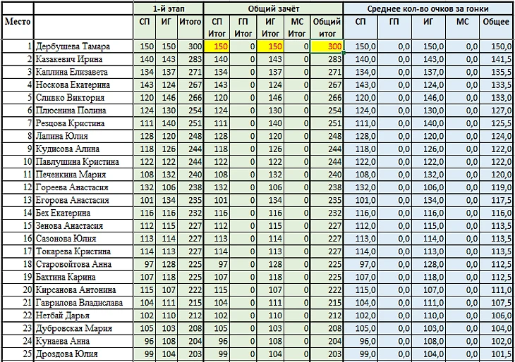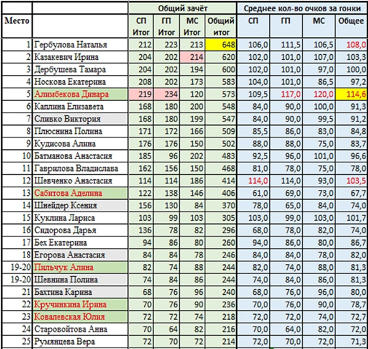 Кого по набранным очкам стоит отметить? Полину Плюснину, Юлию Лапину, Алину Кудисову. Приятно удивила Павлушина Кристина. Ей всего 20 лет, но не стушевалась среди взрослых, выступила достойно. Первые гонки провела Кристина Резцова. Пока не в форме. Подождём. Любопытно ведь, как скажется на Кристине сочетание нескольких факторов: отдаление от послеродового эффекта, статус сезона (постолимпийский, домашний), специфика подготовки и болезни летом. Гербулова, Шевченко Настя, Куклина, Буртасова и Батманова не выступили в ИГ, поэтому в топ-25 их пока нет.