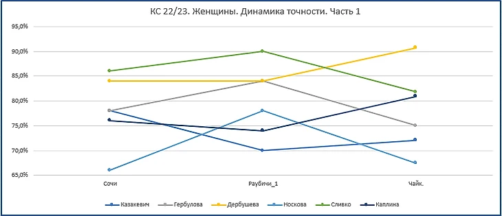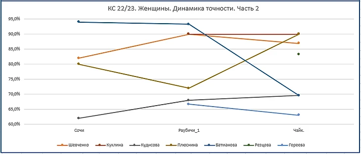 Графики точности и скорострельности разбил на две части каждый. Потому как при таком количестве спортсменок один график был бы совсем нечитаемым. На первом графике динамики точности хорошо виден секрет успеха Тамары в Чайковском.