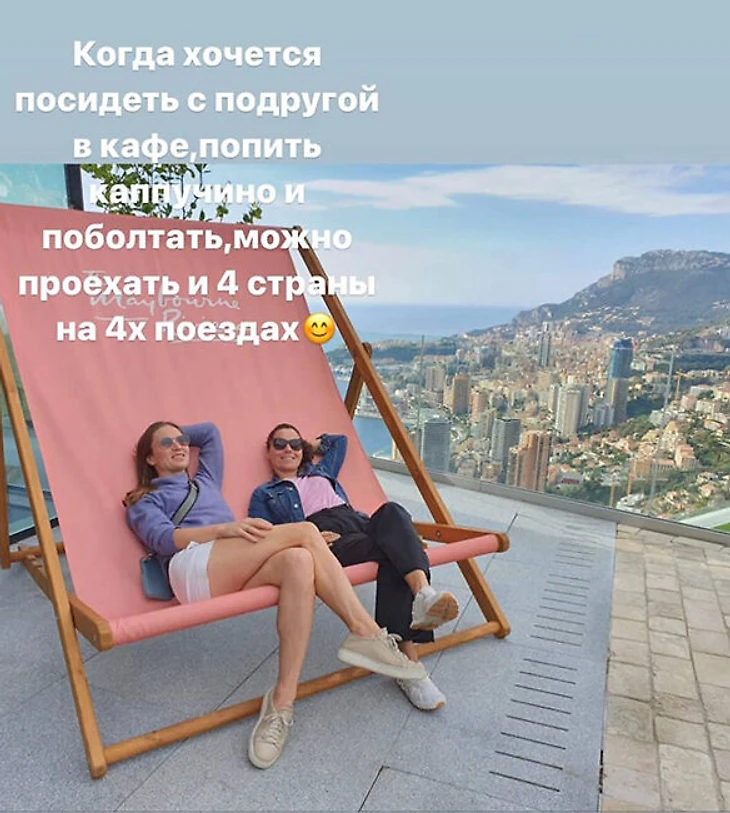 7. В конце октября подруга Домрачевой по белорусской команде Надежда Скардино опубликовала фото с Дарьей на фоне пейзажа, в котором опознается Лазурный берег, и написала: «Если хочется посидеть с подругой в кафе, попить капучино и поговорить, можно проехать и четыре страны на четырех поездах».