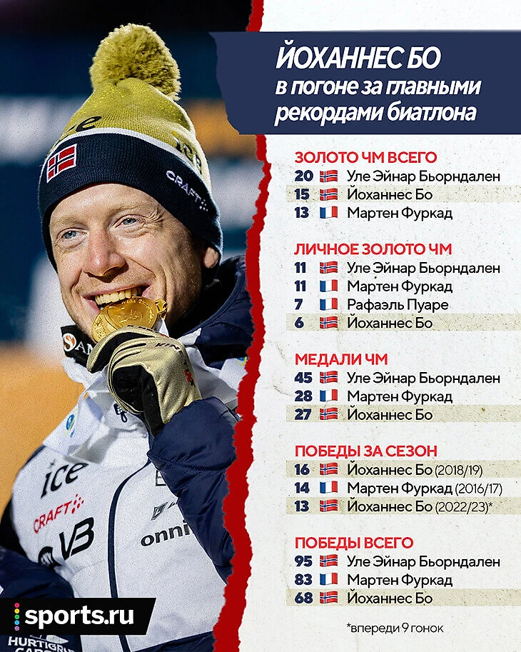 Уже опередил Мартена по золотым (15 против 13), а вот достать Уле (20) в Оберхофе точно не выйдет. По общему количеству наград Бо готов обойти Мартена в ближайшие дни (27 на 28), но для атаки на Бьорндалена (45) надо держать уровень до конца 2020-х.