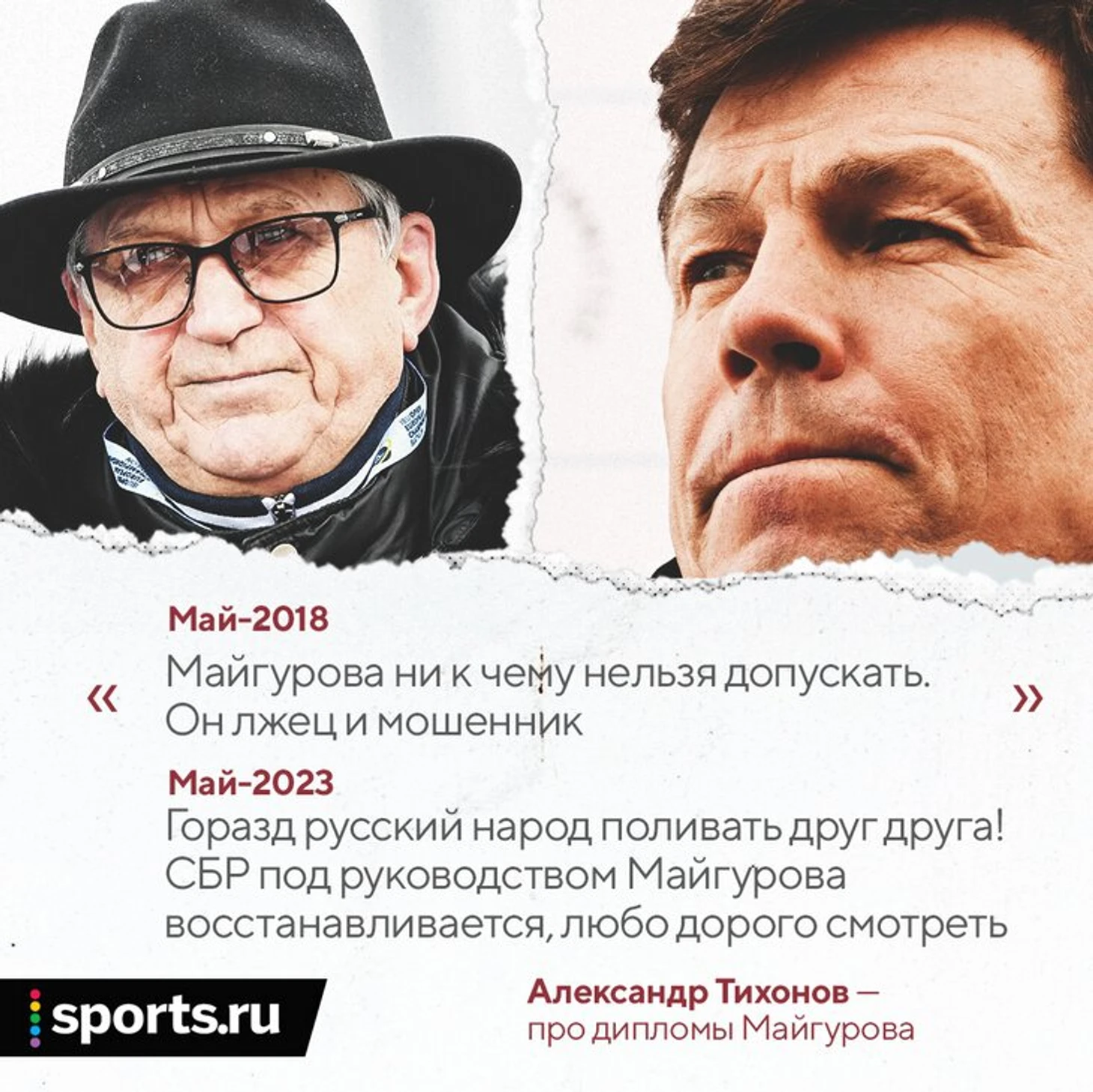 Интересно, что 5 лет назад Тихонов оценивал ситуацию чуть иначе: «Майгурова вообще нельзя допускать. Ни к чему. Когда его назначили министром спорта Ханты-Мансийского автономного округа, у него оказался поддельный диплом, купленный на рынке. Он более 10 лет обманывал всех.