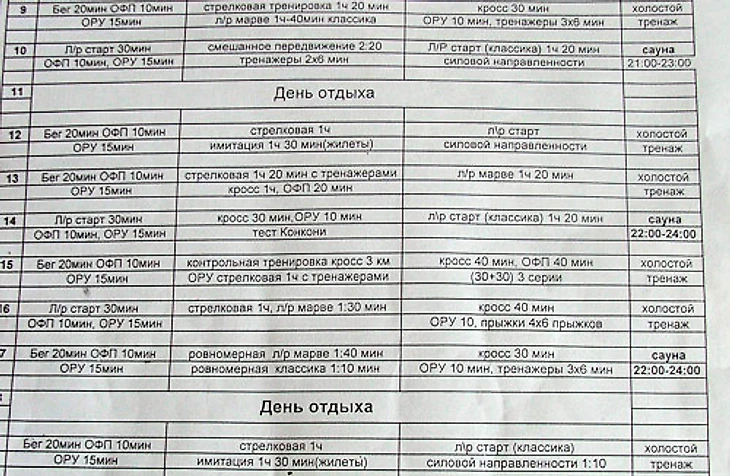 График спортсменов насыщен � три недели сборов, двухразовые тренировки, не считая зарядки и вечернего холостого тренажа, и три выходных. Суммарная продолжительность занятий � 2,5-3 часа ежедневно.
