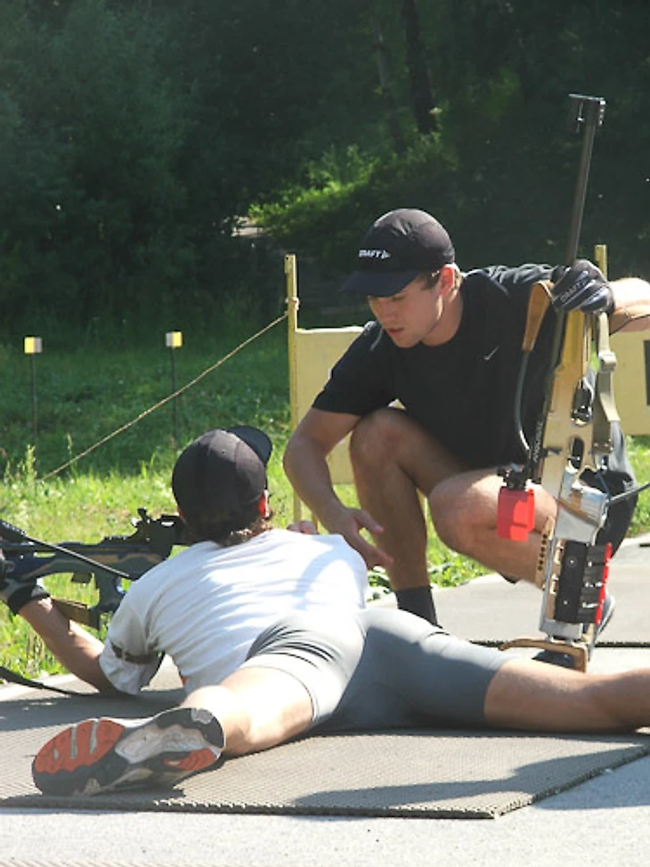 В полдень у юниоров стрельба: сначала работа с изготовкой и потом сами выстрелы. За одно занятие ребята «убивают» по 100 патронов. Перед тренировкой научный сотрудник Александр Дегтярев брызгает на биатлонистов «антимоскитом». Свою порцию получает и корреспондент Sports.ru. Кто-то из парней стреляет по чужим мишеням. Это сразу же пресекается одним из тренеров.
