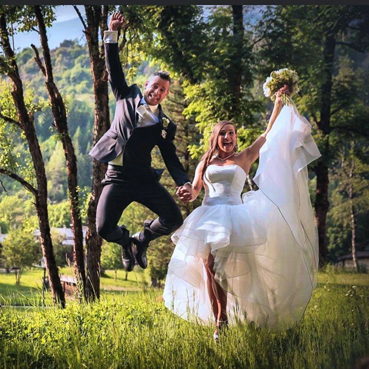 В этом же году Доротея сыграла свадьбу со Стефано Коррадини. Классический фасон платья освежает укороченная спереди юбка.