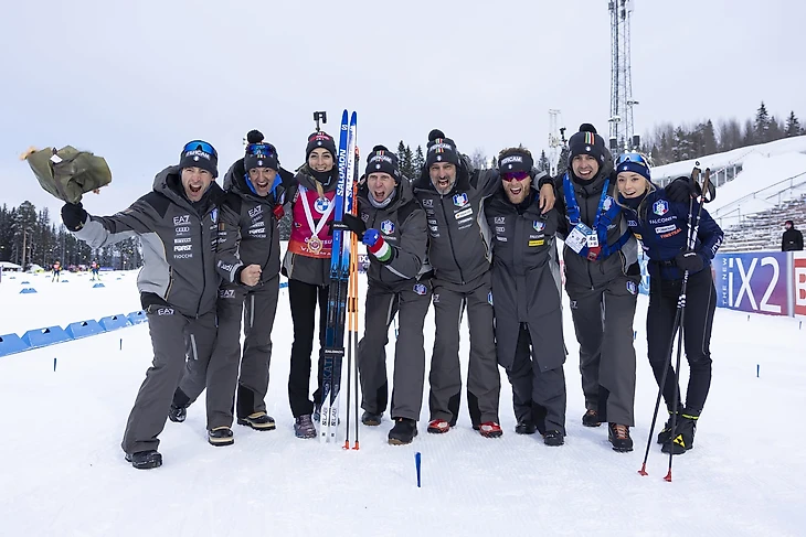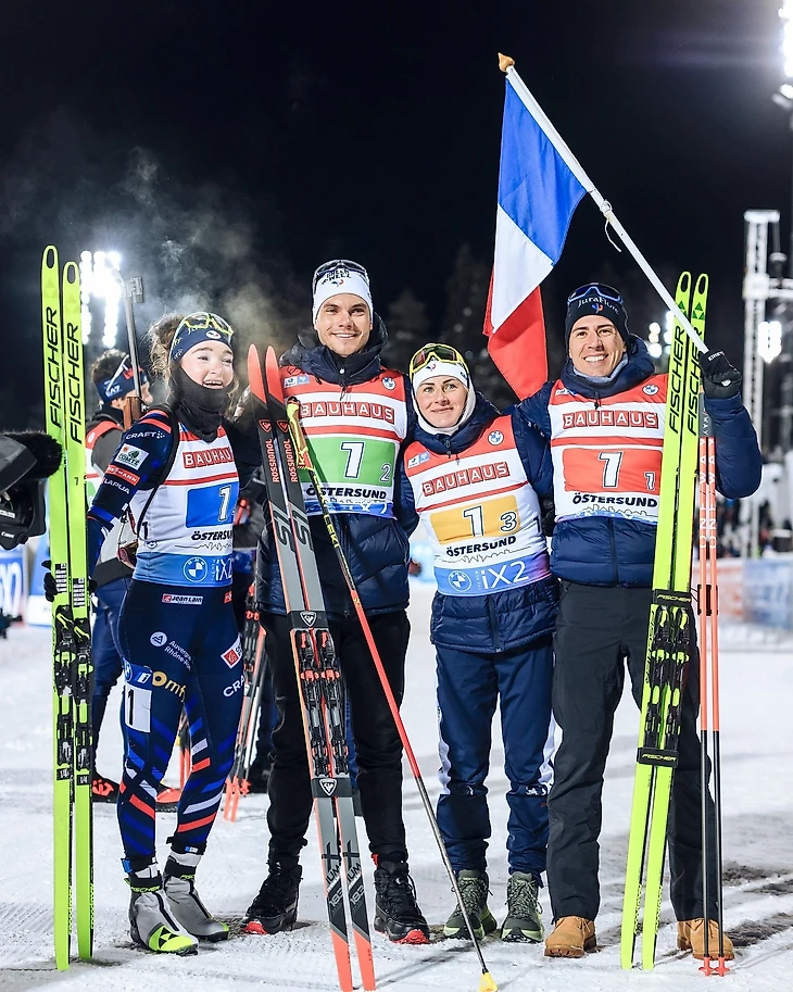 Франция завоёвывает золото, несмотря на штрафной круг, благодаря чему выходит в лидеры зачёта смеешанных эстафет. Норвегия снова на второй ступени подиума, Италия несмотря на штрафной круг и не лучшую форму Доротеи Вирер после болезни попадает на пьедестал. Джереми Финелло проходит эстафету без штрафных кругов, а молодая финская Кайса удерживает свою сборную в десятке.