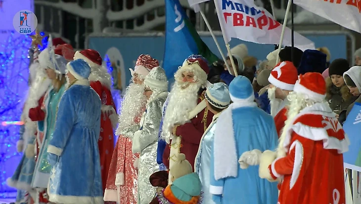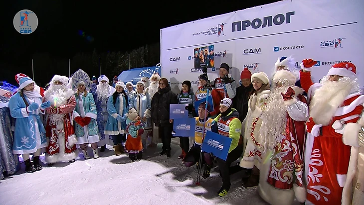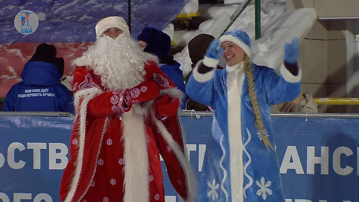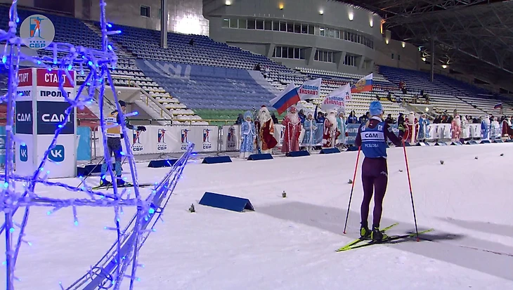 Стартовый городок украсили гирляндами и новогодней атрибутикой. Вообще, праздник пришел в биатлон на месяц раньше положенного. Вдоль трассы стояла бригада из Дедов Морозов и Снегурочек.