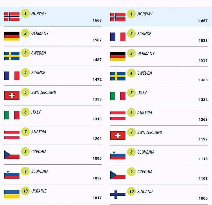 Норвежцы и норвежки несмотря на отсутствие личных побед сохранили лидерство в кубке наций и норвежские девушки на старте сезона этим фактом приятно удивляют. В женской пятёрке произошло изменение: туда ворвались швейцарки, обогнав итальянок. У мужчин же швейцарцы несмотря на хорошие выступления Штальдера пока седьмые, так как поддержки от товарищей он пока не получает, в отличие от той же Италии, где на старте сезона хороши Бьона, Джакомель и Хофер. А вот в десятку вместо украинцев попали финны.