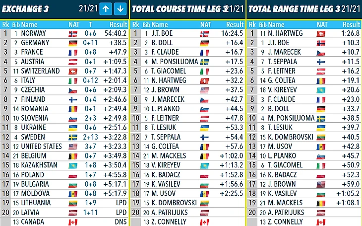 На первом круге третьего этапа Йоханнес Бё не торопился, работая вместе с Бенедиктом Доллем, да и после первой стрельбы они были рядом, ведь пускай Йоханнесу понадобился на один дополнительный патрон меньше, отстрелял он ненамного быстрее Бенедикта. Но сильно приблизиться к лидерам никому не удалось, а американская сказка и вовсе закончилась после трёх штрафных кругов от Джейка Брауна, отбросивших сборную за пределы первой десятки. На втором круге норвежец начал создавать задел, подходя к стрельбищу с преимуществом, которое он только увеличил благодаря своей быстрой и точной работе на рубеже и трём дополнительным патронам у немца. Австрия и Словения на шестом рубеже ошиблись впервые за гонку и если Феликс Ляйтнер закрыл мишени из шести, то вот Ловро Планко ушёл на два штрафных круга, из-за чего словенцы выпали из десятки. На рубеже разменялись позициями и борцы за прошлогодний зачёт до 25 лет: Никлас Хартвег и вторую стрельбу провел без промахов, а Томмазо Джакомель же вновь использовал все восемь патронов, что позволило приблизиться к нему Йонасу Маречеку. К смене этапа шведы усилиями Мартина Понсилуомы уже были двенадцатыми, находясь в полуминуте от десятки.